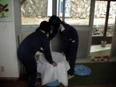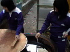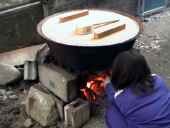 | 私たちも一度はがっかりしましたが,逆に俄然ファイトが出てきました。 そして,この失敗にこりて,今度は給食に使っていた大きな鉄釜でかん水作りを再スタートすることになりました。 時間も残り少ないし,追い込まれて私たちも必死になりました。 自分たちの思いを実現するために・・・。 |