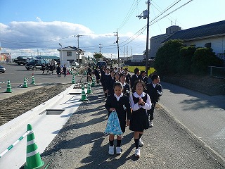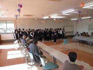 | 学校から30分の道のりを歩いていきます。 | おじいちゃん,おばあちゃんへ代表があいさつします。 |