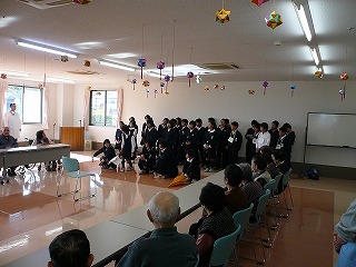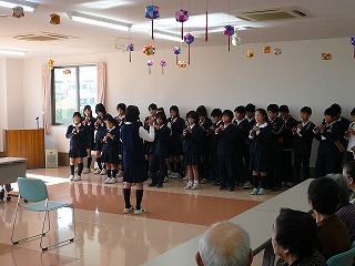私は,今日松寿園に行って,いい経験をしたなと思いました。 最初にした「雨ニモ負ケズ」の寸劇はとても緊張しました。 私は未完成の部分が担当で少々とまどいましたが,なんとかうまくいったのでよかったです。 次の合奏では指揮をしましたが,少し曲と合わない部分がありましたが,こちらも何とか大丈夫でした。 最後におじいちゃん,おばあちゃんとふれ合いました。 横を見るとH君が握手をしていました。 私も87歳のおばあちゃんと握手をしました。 とても楽しくて,いい日になったなあと思いました。 |