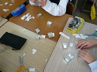 | いよいよ作成したマスコットを樹脂に封入します。 その前に樹脂を流し込む型が必要です。 マスコットが入る大きさの箱形にする必要があります。 6年生の算数で学習した直方体の形です。 縦,横,高さのサイズが決まれば,体積が求められるので,その個数から大まかな樹脂の量もわかります。 展開図を描いて,アルミ用紙で直方体を組み立てていきました。 |