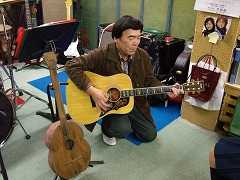 ![]() 先生の思い出の手作りのギターを横に置いて演奏です。 |