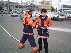 ![]() 消防服を着て,放水を体験させていただきました。 |
