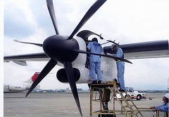 ←離陸前にプロペラの整備をしている様子。 だいたい3人ですることが多い。 |