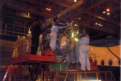 ←写真のように時には飛行機の状態によって,エンジンを取り外してするような大がかりな整備,修理もある。 | ![]() |