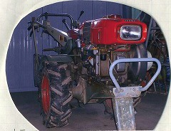 A耕運機 トラクターの前の時代の農機具で,仕事はトラクターと同じです。 歩行用なので、肉体労働です。 現在でも狭い田んぼや山間部などで使用されています。 |