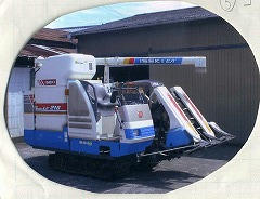 Dコンバイン 昔は鎌で稲刈りをしていました。 それからバインダーという歩行型の機械へと移り,現在はコンバインといわれ高額でよい機械は暖房やエアコンもついています。 |