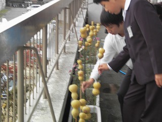 | 次は,表面の薄皮をはがすために,1週間ほど水につけておきます。 約1週間後,取り出したひょうたんの外の皮をむいてよく洗い,乾燥しておきます。 教室の緑のカーテン用プランターに植えたコスモスとともに干しておきました。 乾けば,下準備は完了です。 |