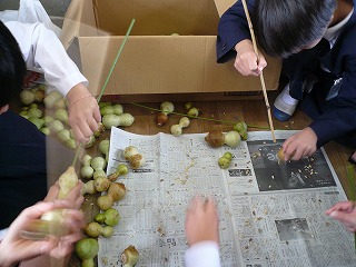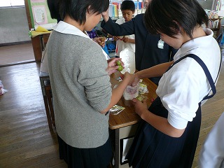 ひょうたん商品化に欠かせない紐の結び方について練習しています。とても難しかったけれど,何人かはマスターしたようです。 |