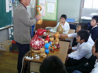 | 様々な苦労をしながら,一応ひょうたんが細工できるところまではできました。 これからそれを商品化することになります。 買ってもらえる商品にどのようにすればいいのか,きれいな仕上げ方とはどんなのかなど,たくさんの疑問があります。 そこで,いろいろなひょうたん加工をされている岡久さんに来ていただき,教えていただくことにしました。 |