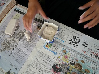 | 全員で協力して作ります。 | 大きさを整えるため,牛乳パックの枠に入れます。 |