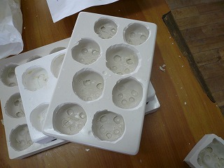 | 作った模型を元にシリコンで固めた型ができあがりました。 しかし,5つの候補のうち,突起が多い複雑な形のものは,取り外すときにポキンと折れてしまうことがわかりました。 そこで,5候補の中で,まん丸の形をした作品をメインに作成することにしました。 |