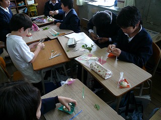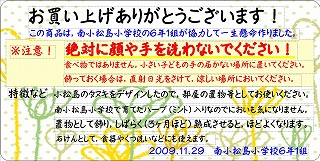 | 商品として売り出すにあたり,包装するアイデアを出し合いました。 出されて,決定したのは, @色紙を入れて,バックを明るくする。 Aミントの葉を1枚一緒に入れる。 B注意書きや特徴などを書く。 の3点でした。 |