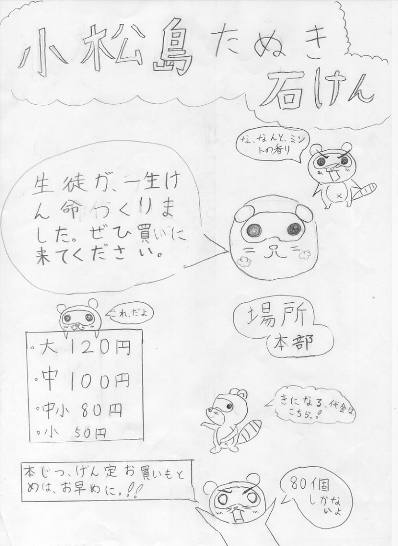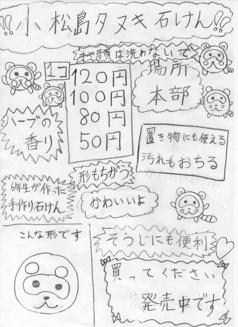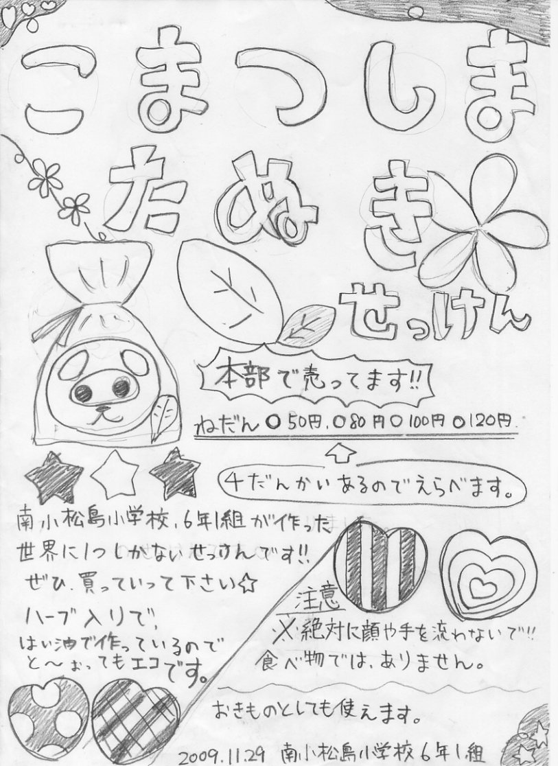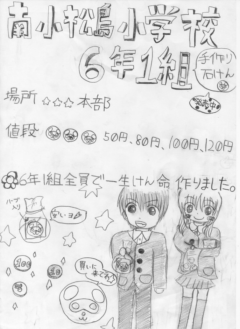 | ここにきて学級閉鎖で1週間の休みは困りました。 しかし,石けん作りは,6年3組の人たちが手伝ってくれたおかげで,なんとかできました。(ありがとう!) 学級閉鎖が終わって,販売予定の「小松島うまいもん祭り」まであと1週間。 例年よりも1週間早いイベント開催です。 準備のほうも急ピッチで進めました。 |
