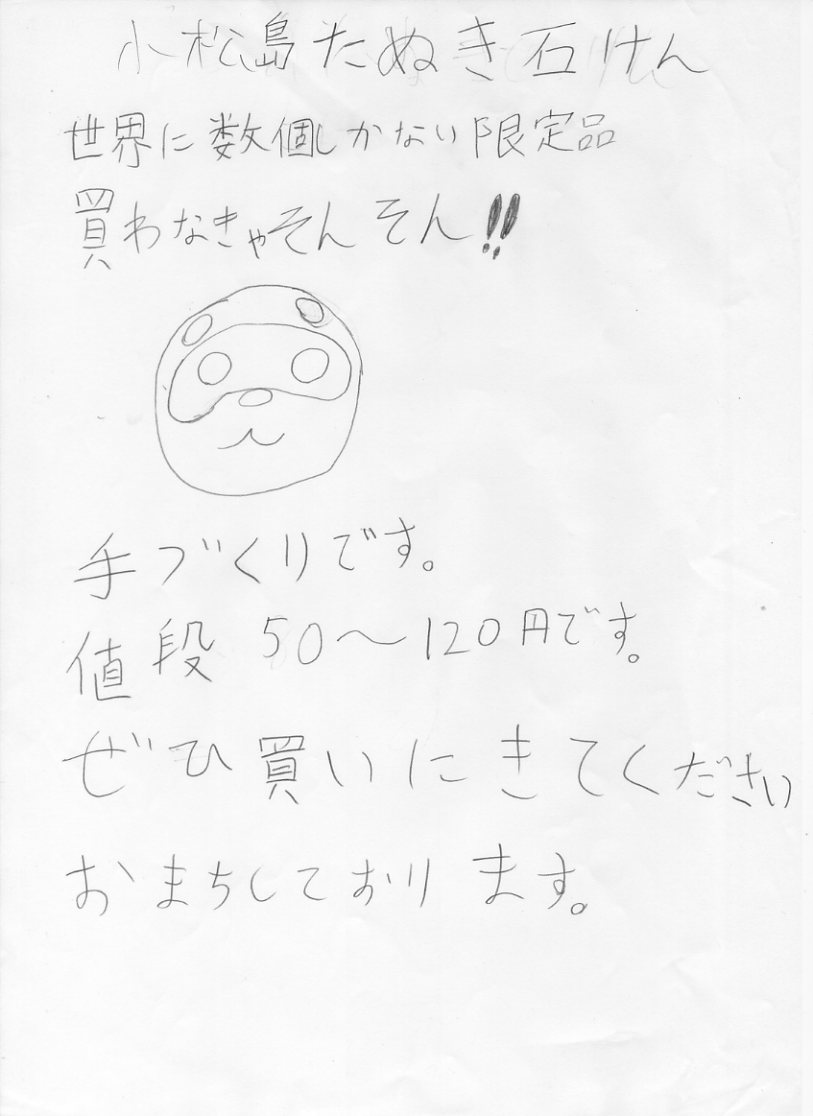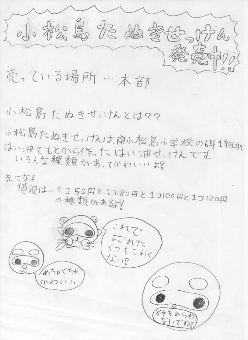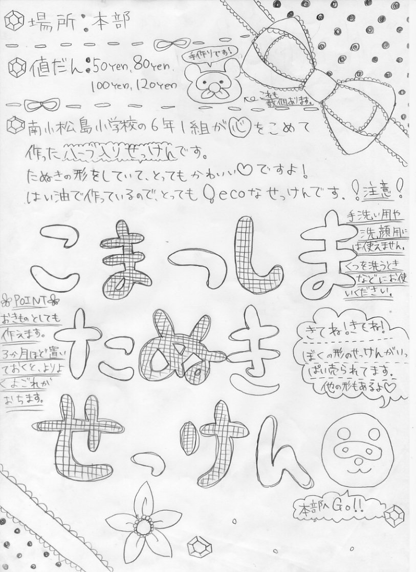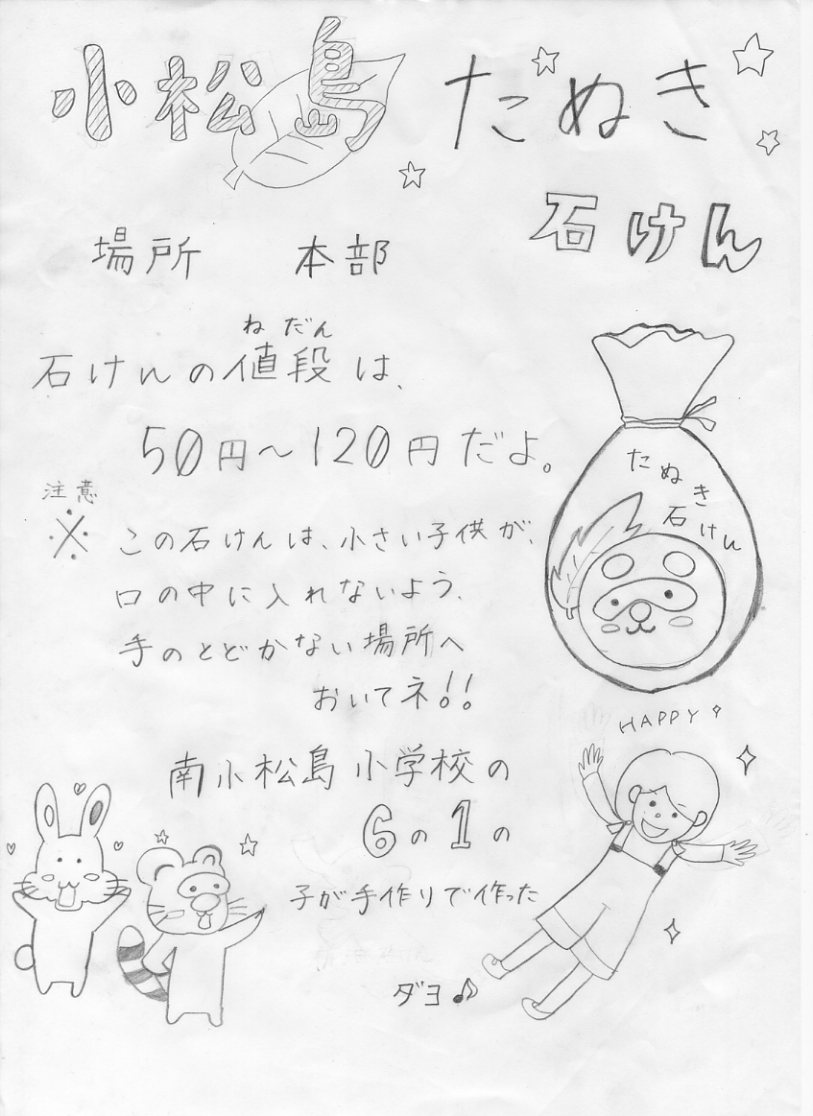 | ここにきて学級閉鎖で1週間の休みは困りました。 しかし,石けん作りは,6年3組の人たちが手伝ってくれたおかげで,なんとかできました。(ありがとう!) 学級閉鎖が終わって,販売予定の「小松島うまいもん祭り」まであと1週間。 例年よりも1週間早いイベント開催です。 準備のほうも急ピッチで進めました。 |