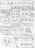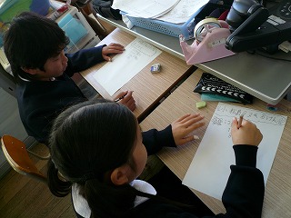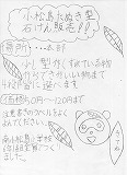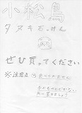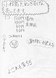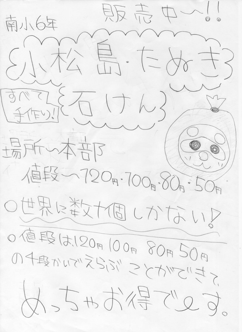 いよいよ販売に向け様々な準備をすることとなりました。 これまでは,会場でちらし(ビラ)を配っているのですが,何人かの書きたい人や係に決まった人に書いてもらっていました。 本年度は,全員に書いてもらい,デザインや思いが伝わるものという観点でコンテスト形式で選ぶことにしました。 一生懸命に取り組み,思いの詰まったいい作品がたくさんでき,選ぶのに苦労しました。 ちなみによくできているチラシは,印刷枚数比率が増えるということになっていました。 できあがった,チラシの一部を見てください。 |