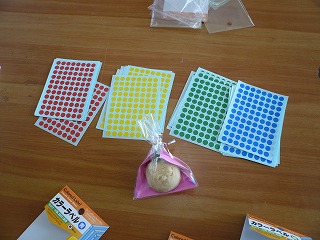 | ということで,今回は,とりあえず利益回収は抜きで最低限の消耗品(水酸化ナトリウム,包装費等)くらいから考えてみました。 さらに,昨年度までの先輩たちの反省も生かし,商品に見合った妥当な値段というものを追究してみることにしました とりあえず,最高は120円で,あとできばえや見た目により,100円,80円,50円とランク付けをしました。 赤,黄,緑,青のシールを各班で協議し,値段ごとで貼っていきます。 6班のシール合計結果で,値段が決定となりました。 |