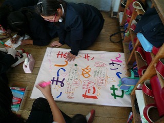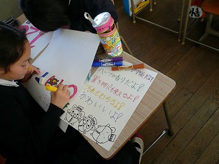 | 幟(旗)を作っています。 | 看板は,3種類も作りました! |