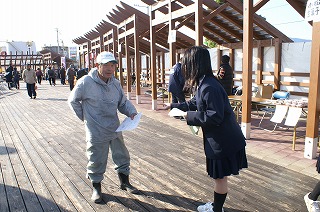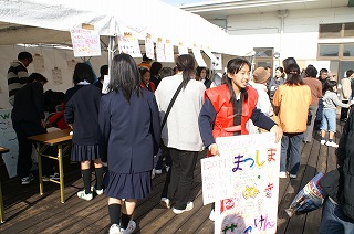 | お客さんの質問にもていねいに説明します。 | 幟を持って,アピールしています。 |