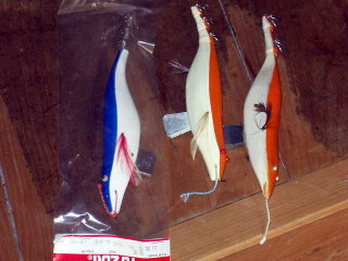 アオリイカは、秋から冬に捕れます。![]() イカは流し釣りで釣ります。 釣るための道具は、イカガタです。(写真) イカガタを糸に付けて船で流しながら待っていて,ひいたら手で引き上げます。 |