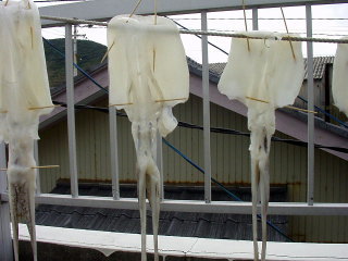 一夜干し ![]() アオリイカはイカの中では高級ですが,伊島では一日ぐらい干して食べます。焼いて,しょう油とマヨネーズをつけたり,からいのが好きな人は、一味をつけて食べるとおいしいです。 他にさしみ、につけなどの方法でも食べます。 右の写真はイカを開いたものに、くしをさして干しているものです。 |