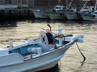 のべなわやたてなわ,1本づりで捕ります。捕れるのは,おもに秋でよく捕れます。 餌は,小さいエビです。 右の写真は,のべなわを巻いている船です。 |