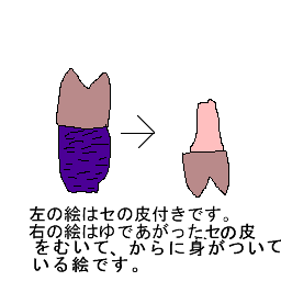 ![]() ゆがいて食べる 鍋に塩水を入れ,セをゆでます。 そしてむいて食べます。 食べ方は,右の絵です。 他にも生で食べたり,みそ汁に入れたりすると聞いたけど,あまりしないです。 |