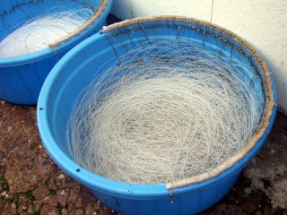 ![]() はえなわで捕ります。 他にもこぎ釣りで釣ります。 こぎ釣りとは,船をこぎながら釣るということです。 1年中捕れます。 右の写真ははえなわのなわです。 |