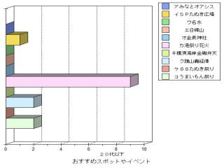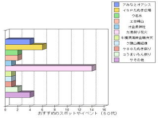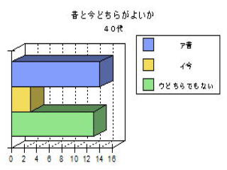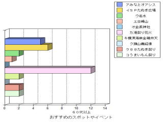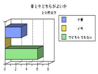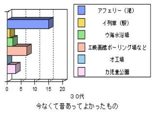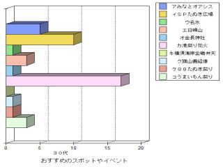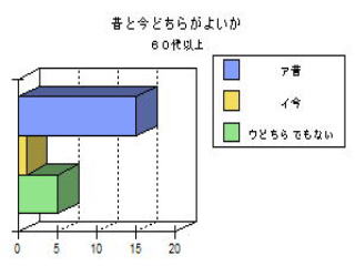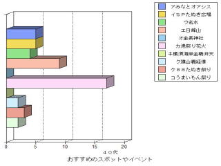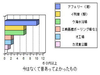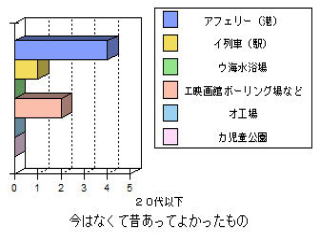 | ○思ったこと ・昔がよかったと答えた人は,年をとっている人に多い。これは昔のことをよく知っているからだと思った。 ・どの年代もフェリー(港)が昔よかったと答えている。60代の人は,海水浴場や列車もあげているが,若くなるほど映画館やボーリング場をあげている。 ・おすすめスポットやイベントとして,どの年代も港祭り花火が一番多い。40代の人が日峰山を比較的多くあげたのはどうしてかな? ・50代の人がおすすめスポットのその他として「あいさい広場」をあげていた。選択しには入ってなかったのだが,わざわざあげたということはみりょくがあるのかも知れない。 |