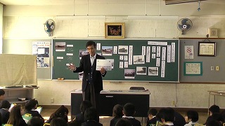 | 南小松島小学校出身で,元校長先生の鳥井先生に昔の小松島の様子について教えていただきました。 多くの写真や資料,びっくりするようなお話しを聞かせてもらいました。 |