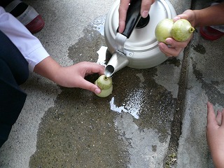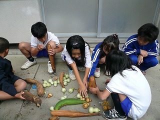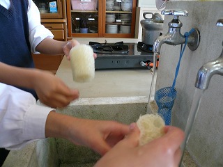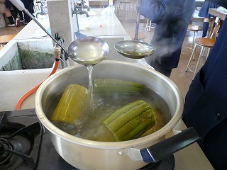 | これまで育ててきたヘチマとひょうたんを使うことに。 | 昨年の6年生が作った廃油石けんを作ることに。 | ヘチマはゆでて皮をむきやすくします。 |