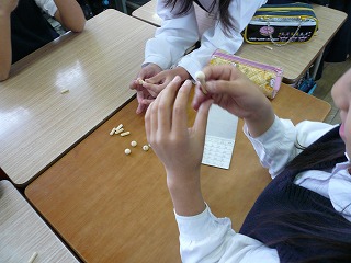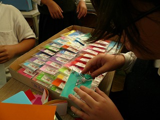 | 商品の値段も相談しました。 「ひょうたん飾り」は,200円。 「ヘチマたわし石けんセット」は,150円。 「幸せを呼ぶストラップ」は,100円。 準備を整えて,いよいよ販売にいきました。 |