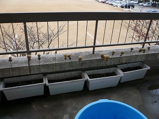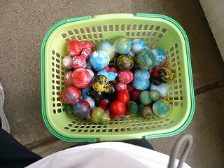| 今回のひょうたんは原価節約のため木栓も手作りです。 | ずらっとベランダに並んだひょうたん。 | ひょうたんに色を付けて,ニスを塗ります。 |