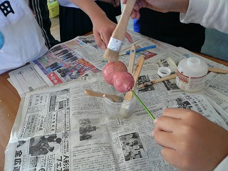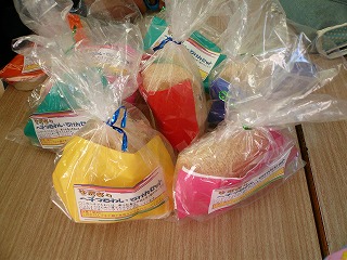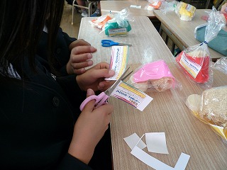 | ひもを結ぶのは,難しかったけれど何度も練習しました。 | ヘチマたわしセットには,ラベルも付けます。 | ネーミングもみんなで考えました。 |