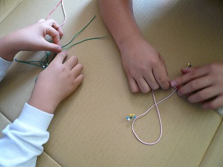 | できあがったひょうたん,カラフルです。 | ひょうたんの紐結び | ひょうたんの紐にビーズを通して,紐代も節約。すべて手作りです。 |