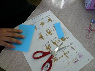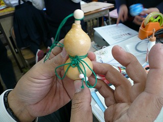 | お年寄りについて学んだ後,老人ホームへ行ったときのことを思い出しました。 「先輩たちのように,おじいちゃん・おばあちゃんに車いすをプレゼントしたい。」 そのために,自分たちにできることでその資金を稼ぐことにしました。 まず,考えたのは,うまいもん祭りでの販売活動です。 そのための商品づくりに取りかかりました・・・。 今回の商品は,ひょうたんを使った「ひょうたん飾り」,ヘチマを使った「ヘチマたわしと石けんセット」,ひょうたんの紐結びをマスターする中で偶然考えた「吉祥結びのストラップ」の3品です。 |