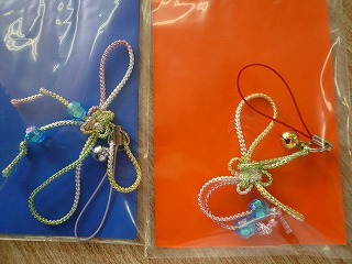 | 商品としてできあがり「生活楽々ヘチマたわし・石けんセット」 | 吉祥結びのストラップ。 「幸せを呼ぶストラップ」と名付けました。 |