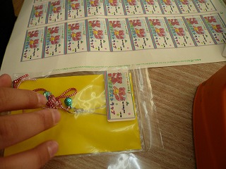 | ストラップにもラベルをつけました。 | たくさんの品物が用意できました。 | ポスターを考えています。 |